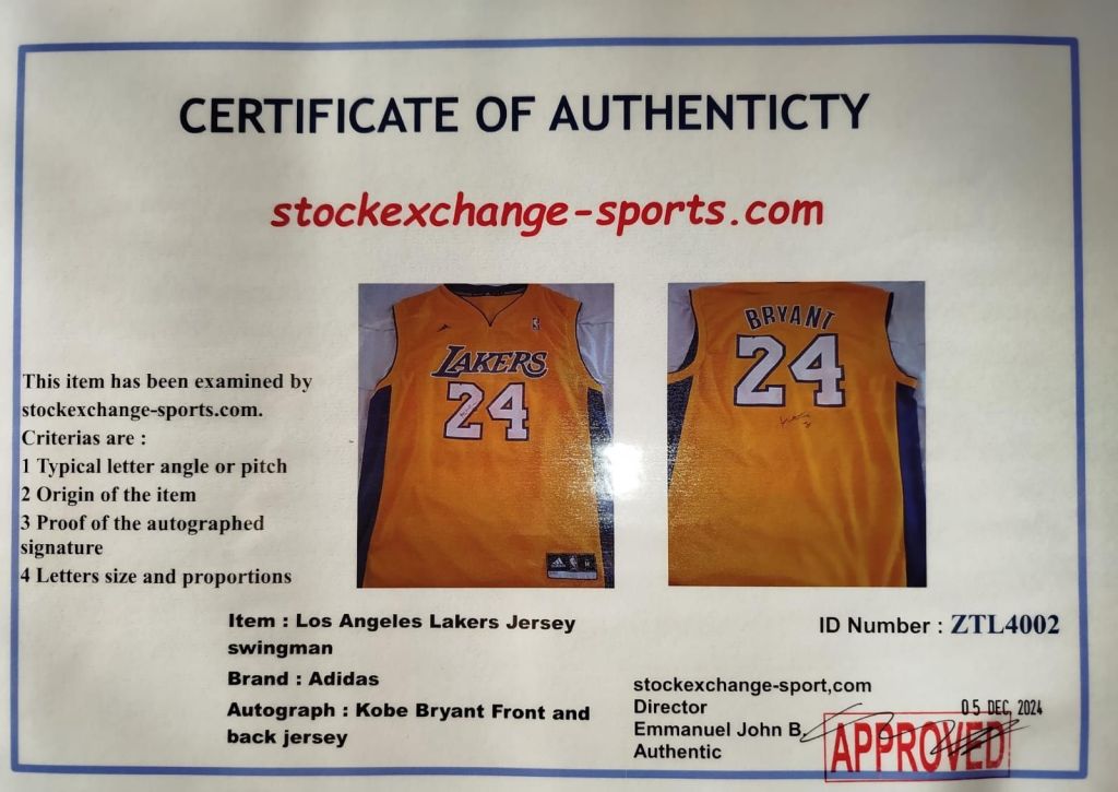 ZTL4002 Maillot signé par Kobe Bryant numéro 24 double signature avant arrière. Dobble signed jersey Kobe Bryant #24.